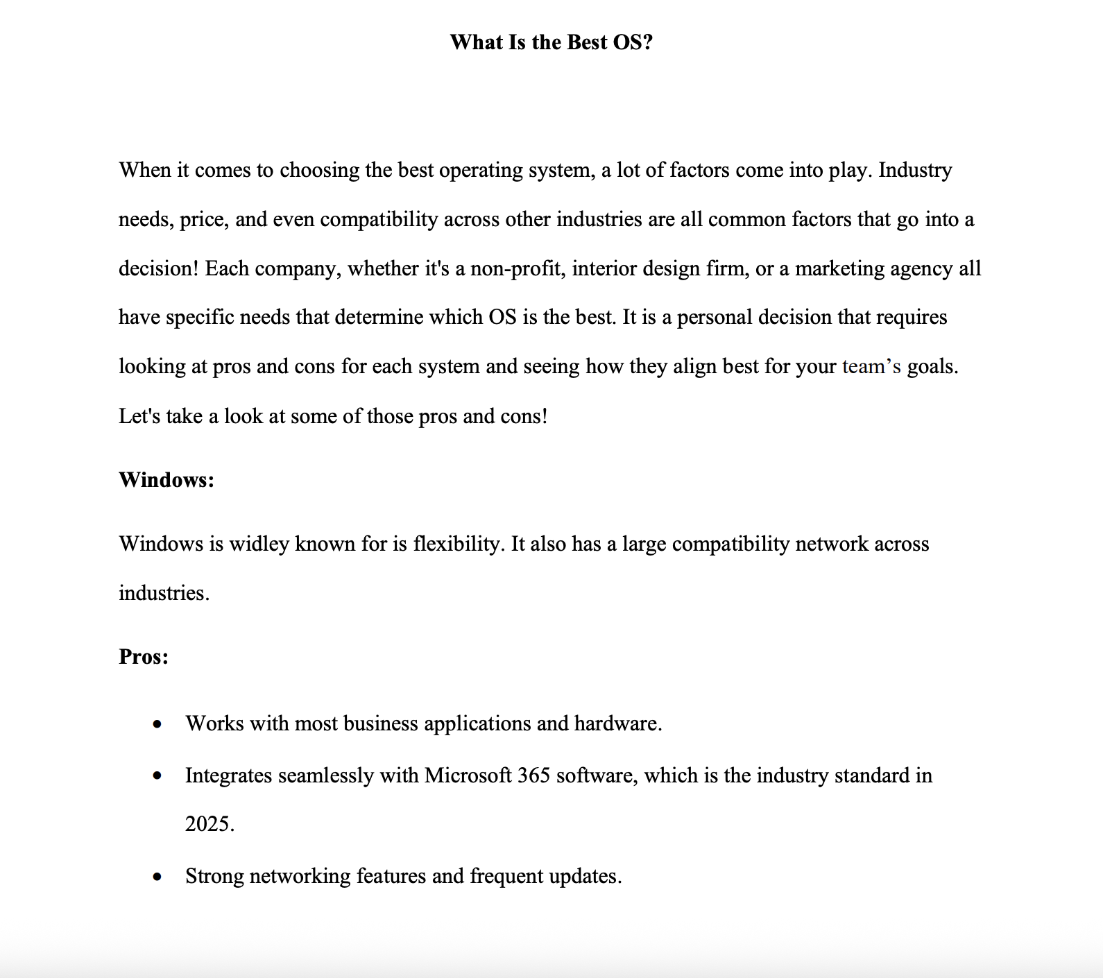 This assignment focused on comparing operating systems based on usability, performance, security, and real-world application. I enjoyed analyzing each system through both a user and organizational lens, weighing strengths and trade-offs to determine which platform best supports efficiency and reliability. The project strengthened my ability to evaluate technology based on purpose, not preference.